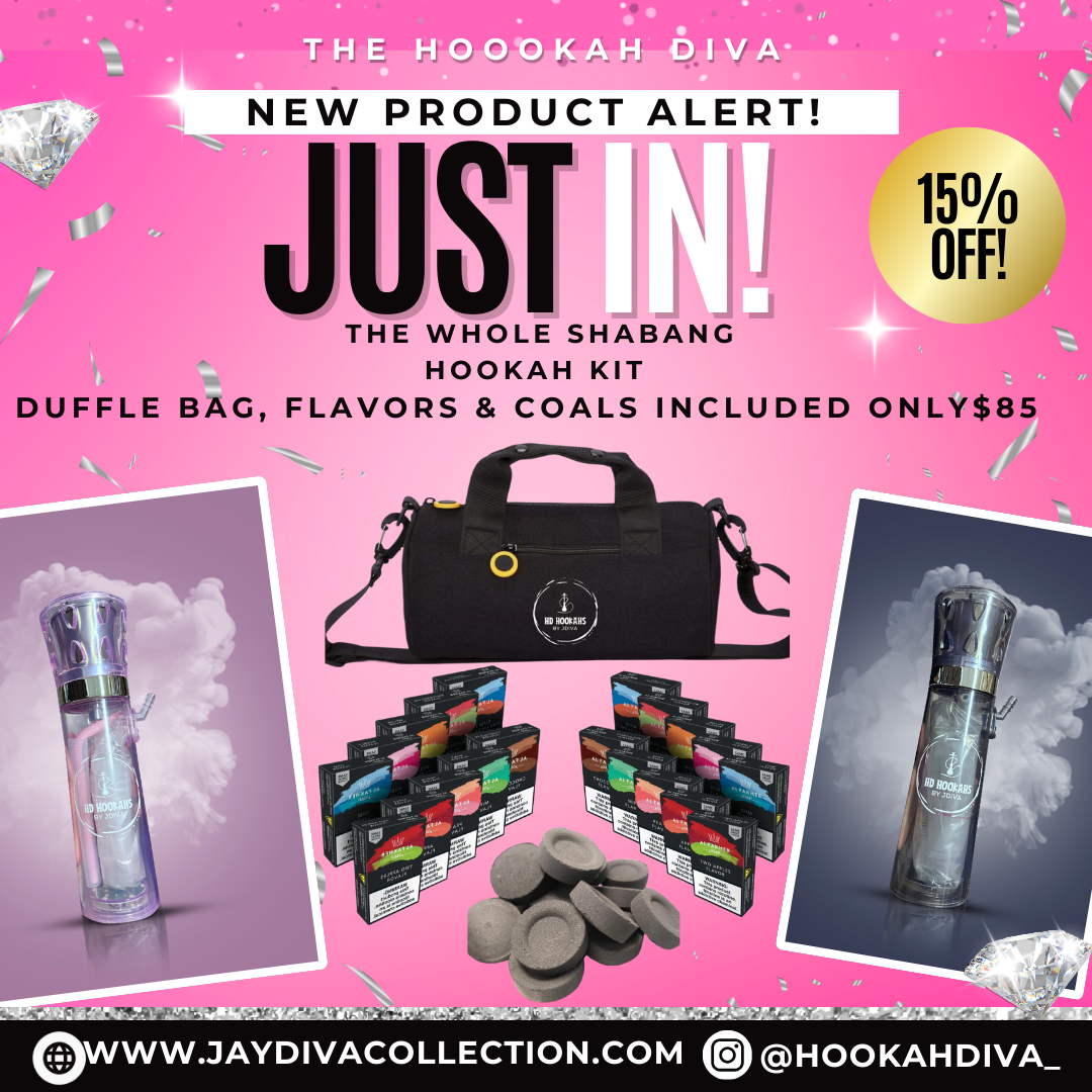 This kit includes a portable hookah, a compact duffle bag to place all your hookah necessities,10 small quick light colas, and 2 small 250 gram flavors of your choice.